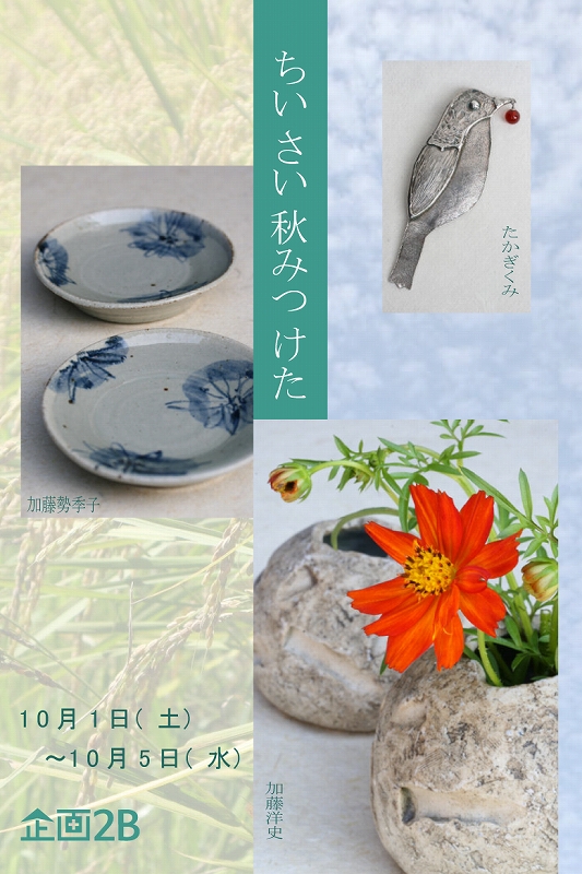 夏の暑さを忘れかけた頃、 夕暮れの街はオレンジ色に染まり、 草叢には虫の声。 あなたのちいさな秋を見つけに お出かけ下さい。 加藤洋史 …… 陶 加藤勢季子 …… 陶 たかぎくみ …… ジュエリー アートハウスN …… 柿渋染のれん 心よりお待ちしております。 |