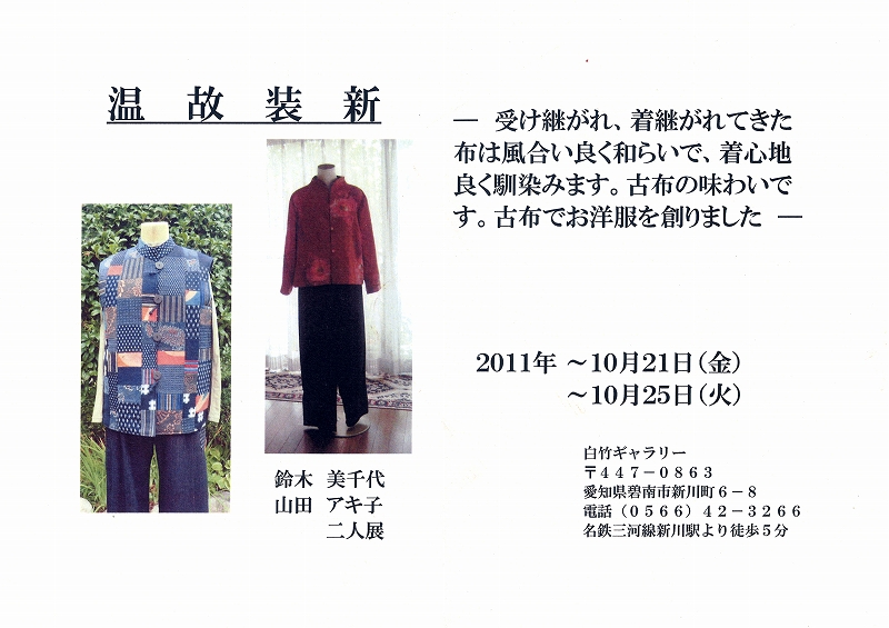 受け継いだ着物でお洋服を創りました。 ぜひ足をお運びください。 鈴木美千代・山田アキ子 心よりお待ちしております。 |