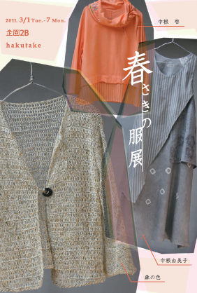 2011.3/1(火)~3/7(月) 中根由美子 <手染服> 蜂須智恵子 -森の色- <ニット> 長田惠子 -森の色- <ニット> 中根啓 <Tシャツ> そろそろ春の衣がえです。 一針一針心を込めて手づくりした 「春さきの服」展です。 はなやぐ白竹ギャラリーでの ひとときをお楽しみください。 PR |